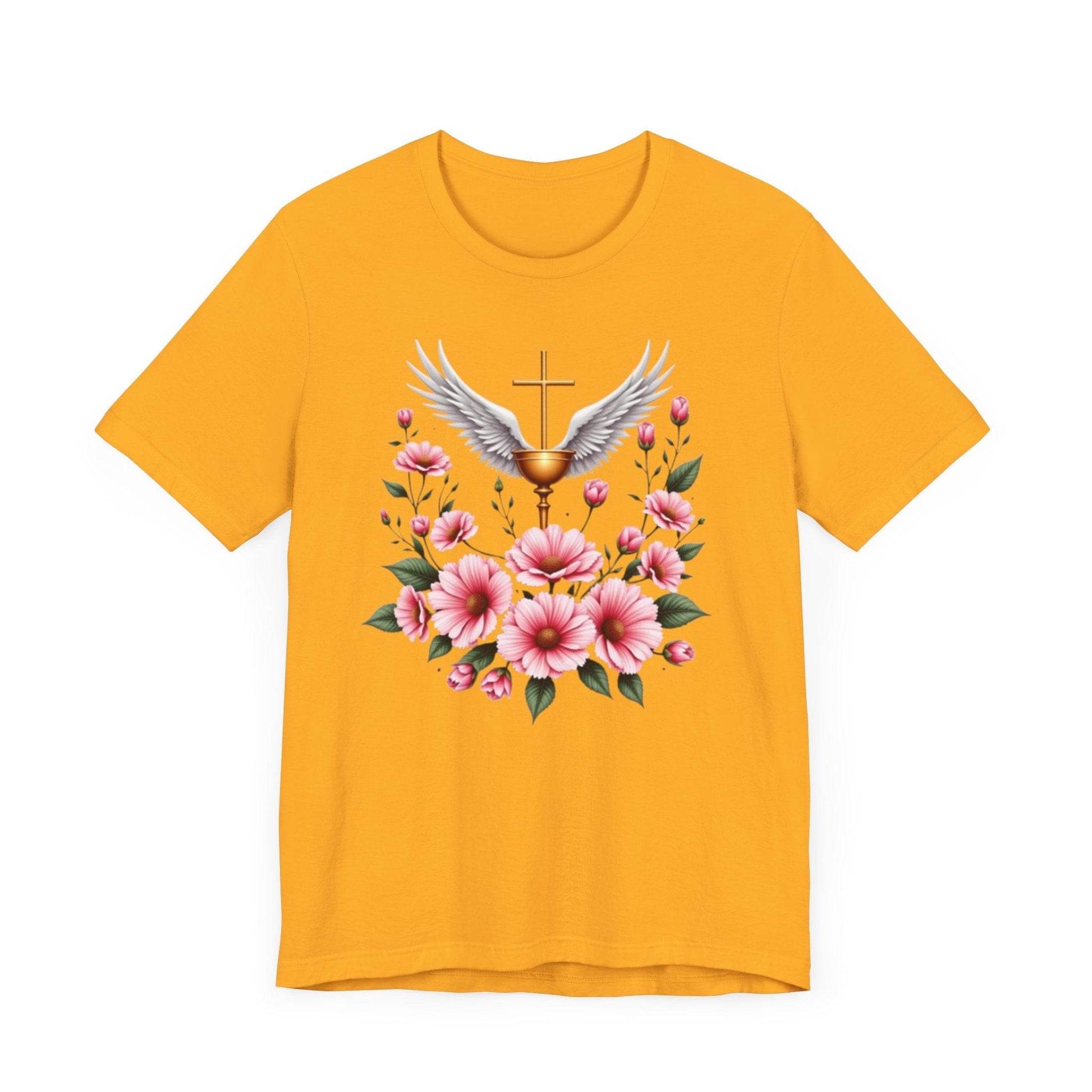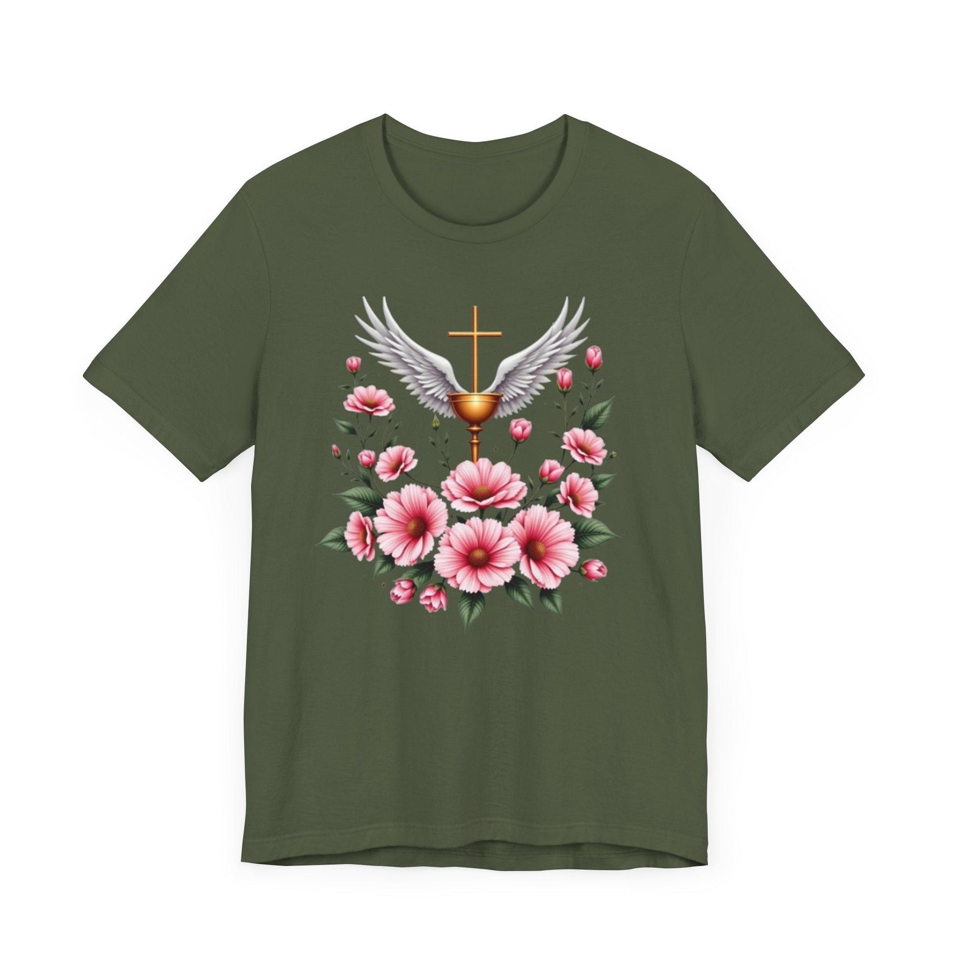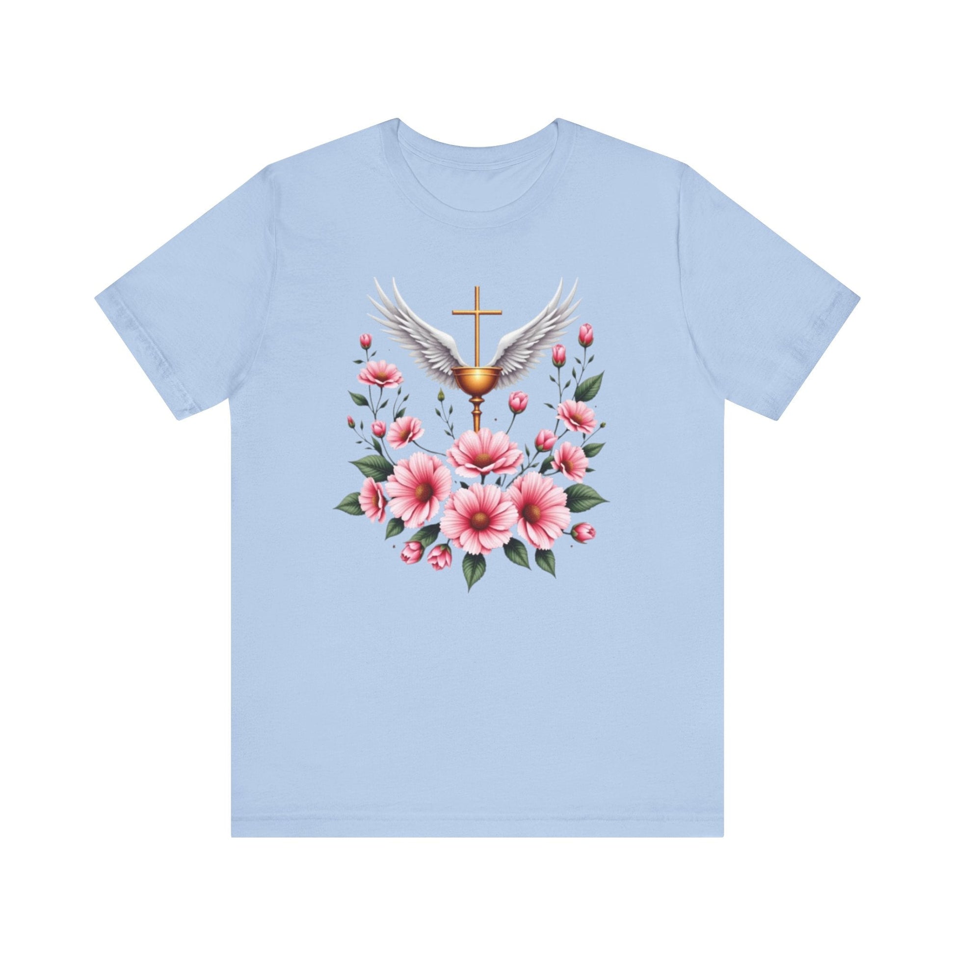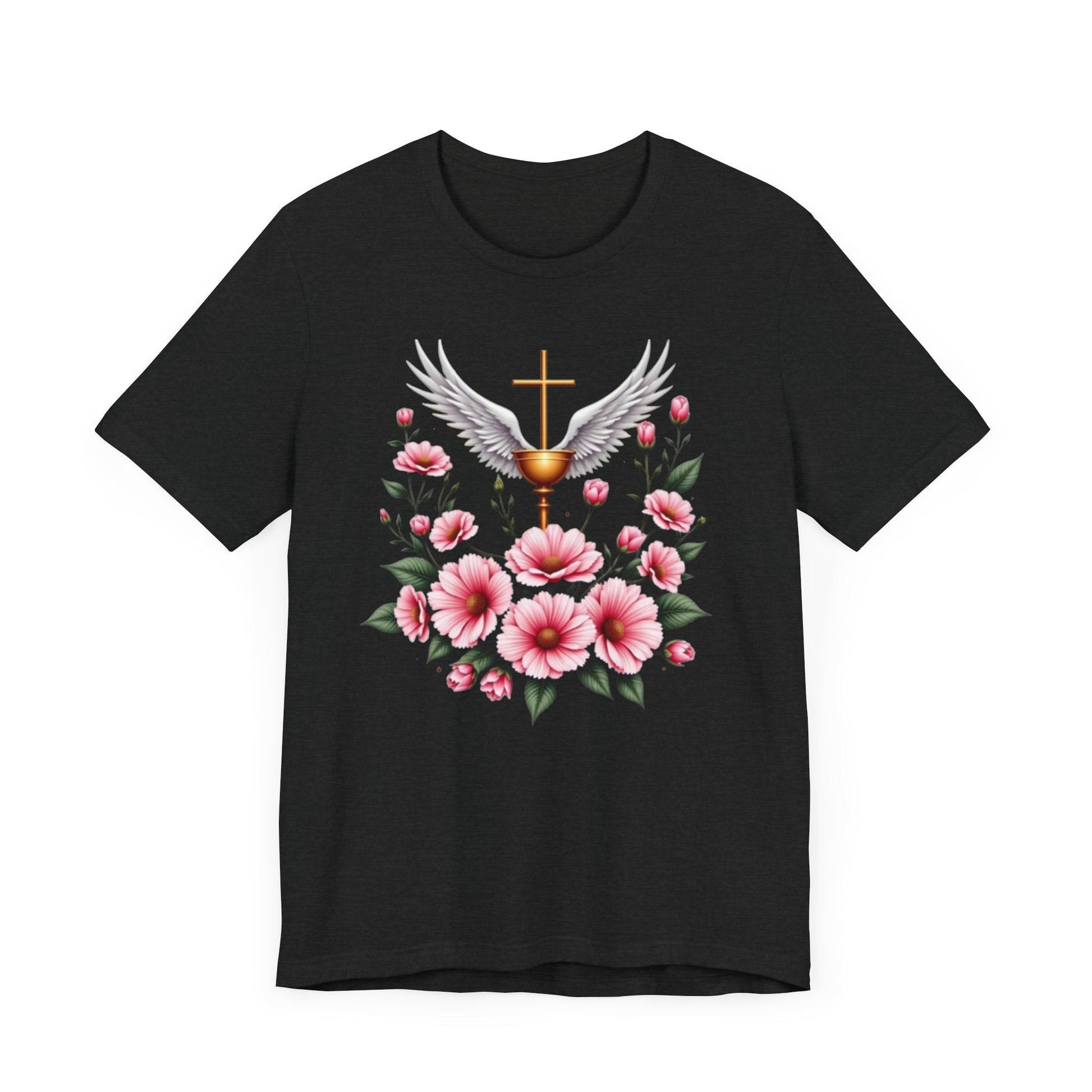 Immerse yourself in a whimsical design showcasing a vibrant garden of cherry blossoms and carnations, beautifully intertwined with subtle Christian symbols. This surreal artwork, featuring dreamy pastels, is perfect for creating serene and imaginative apparel.