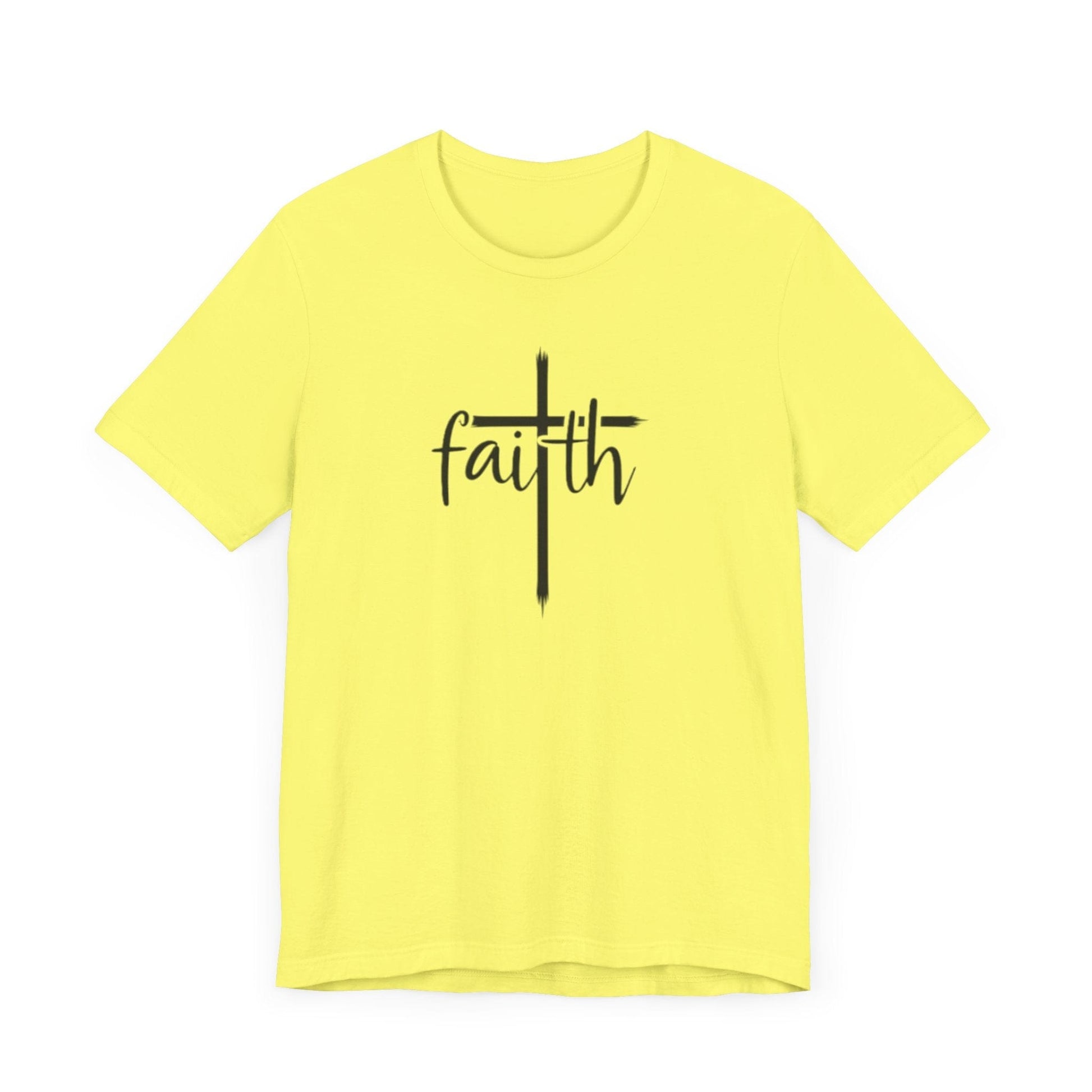 This minimalist t-shirt design features the word 'faith' seamlessly integrated into a beautifully crafted cross, creating an elegant and sophisticated statement piece. Perfect for those who appreciate meaningful art with a clean aesthetic.
