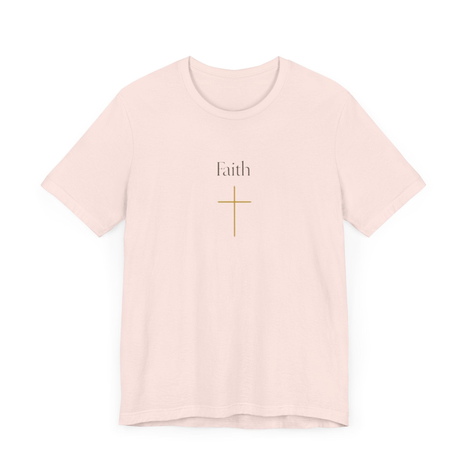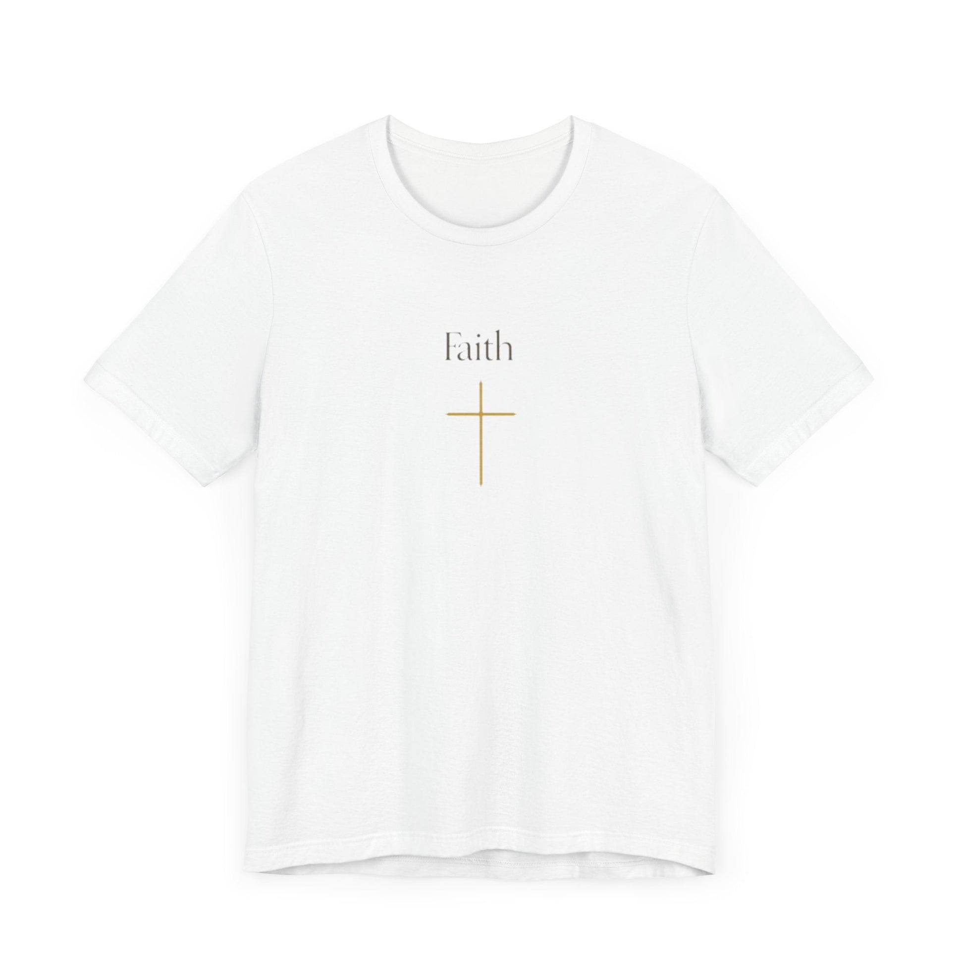 This elegant minimalist design features the word "Faith" in a slim serif font above a delicate gold cross, creating a harmonious vibe against a clean white background. Perfect for those who appreciate understated Christian art.