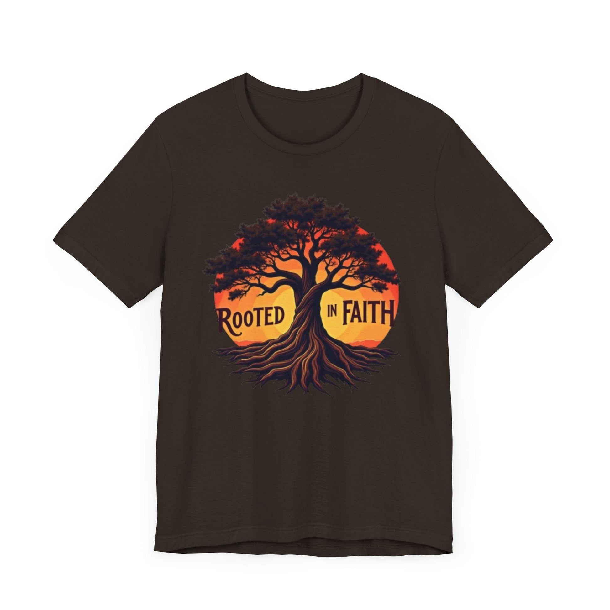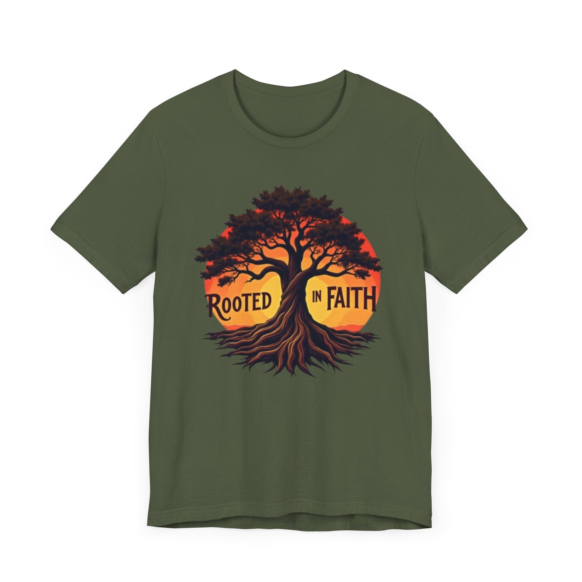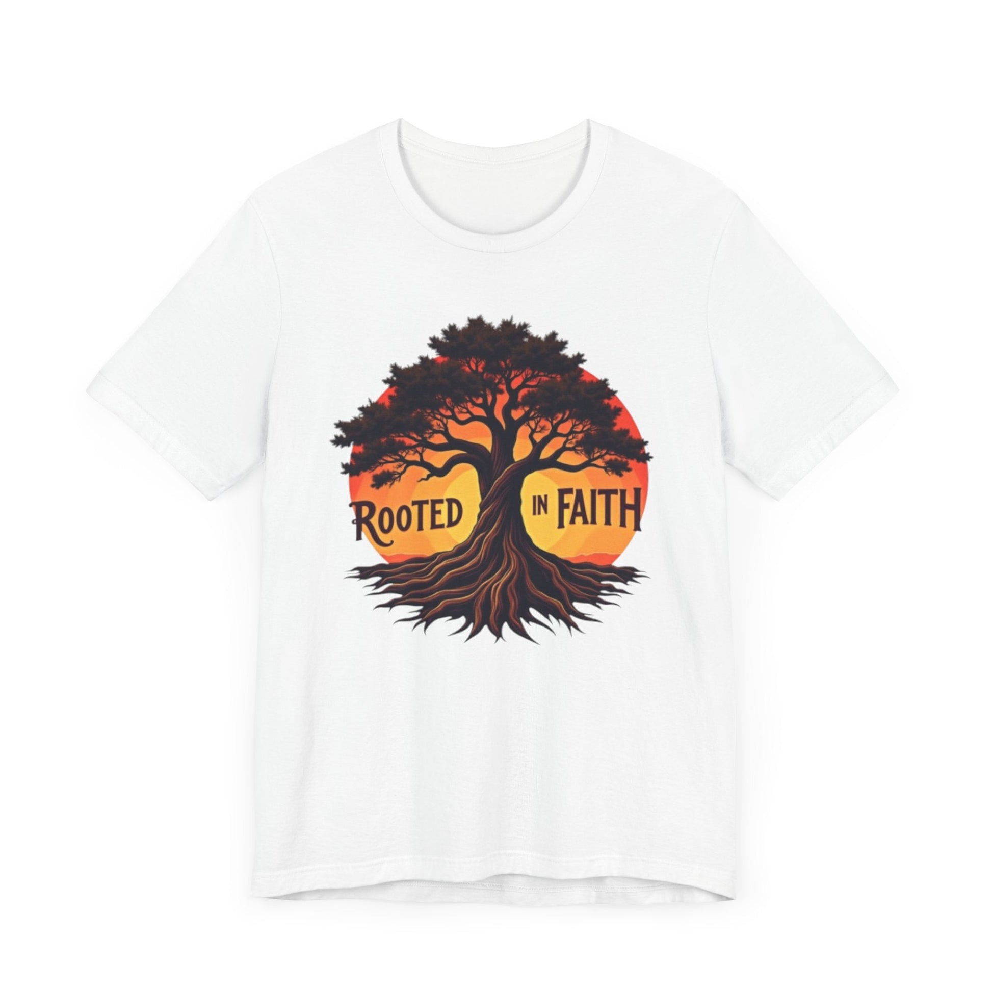 This stunning design features an ancient oak tree against a vibrant sunset, symbolizing strength and resilience with the phrase 'Rooted in Faith' intertwined around its trunk. Perfect for those seeking spiritual inspiration and a connection to nature.