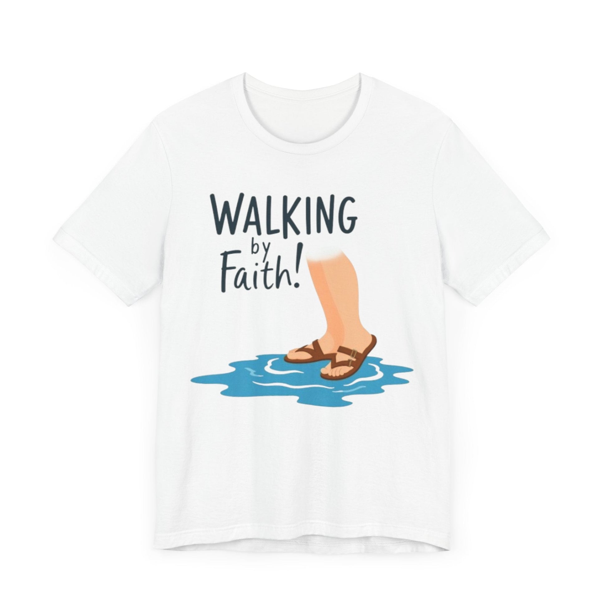 This playful design features the phrase Walking by Faith in a whimsical font, alongside cartoonish feet in sandals walking on water, radiating joy and lightheartedness with its soothing color palette of blue, white, and light brown.