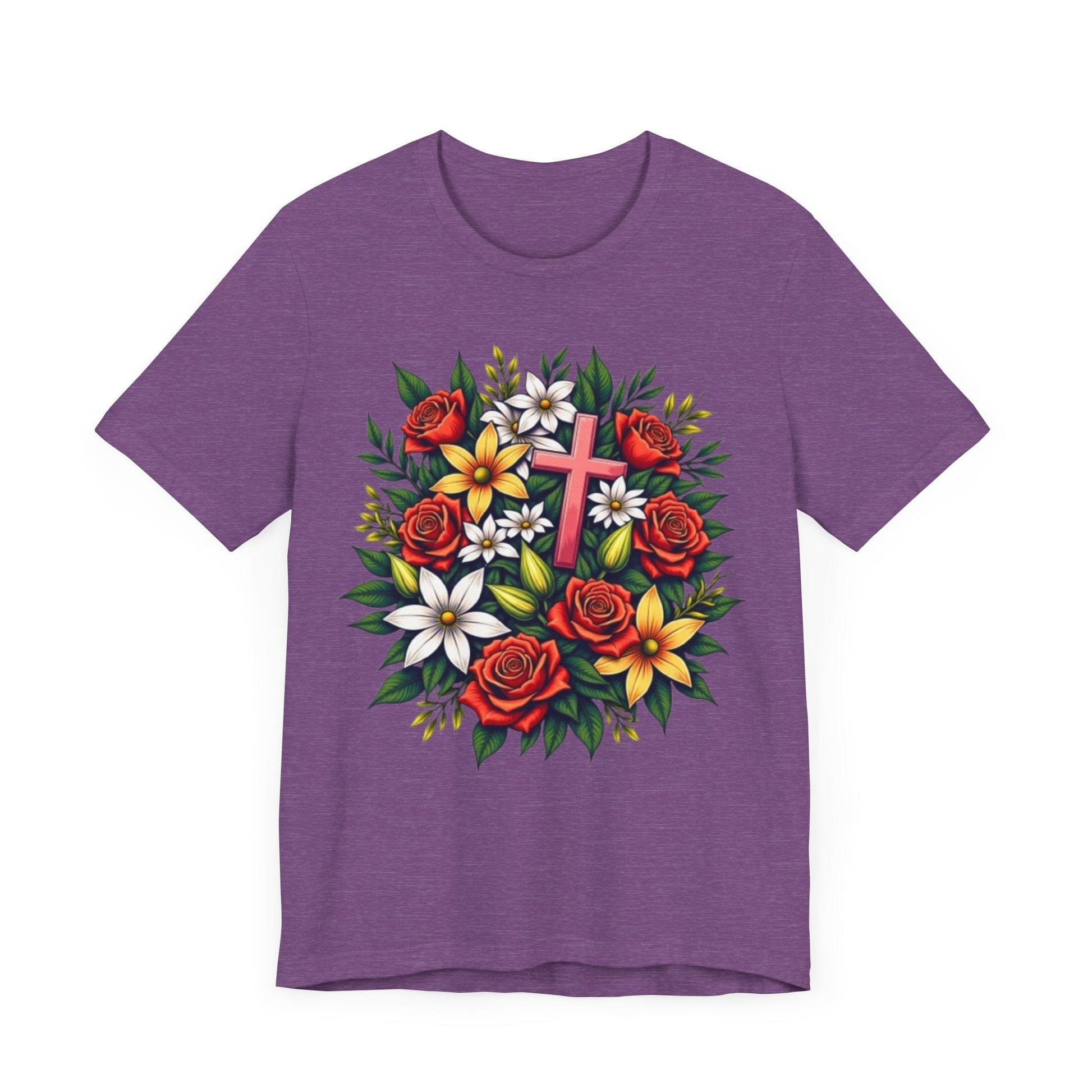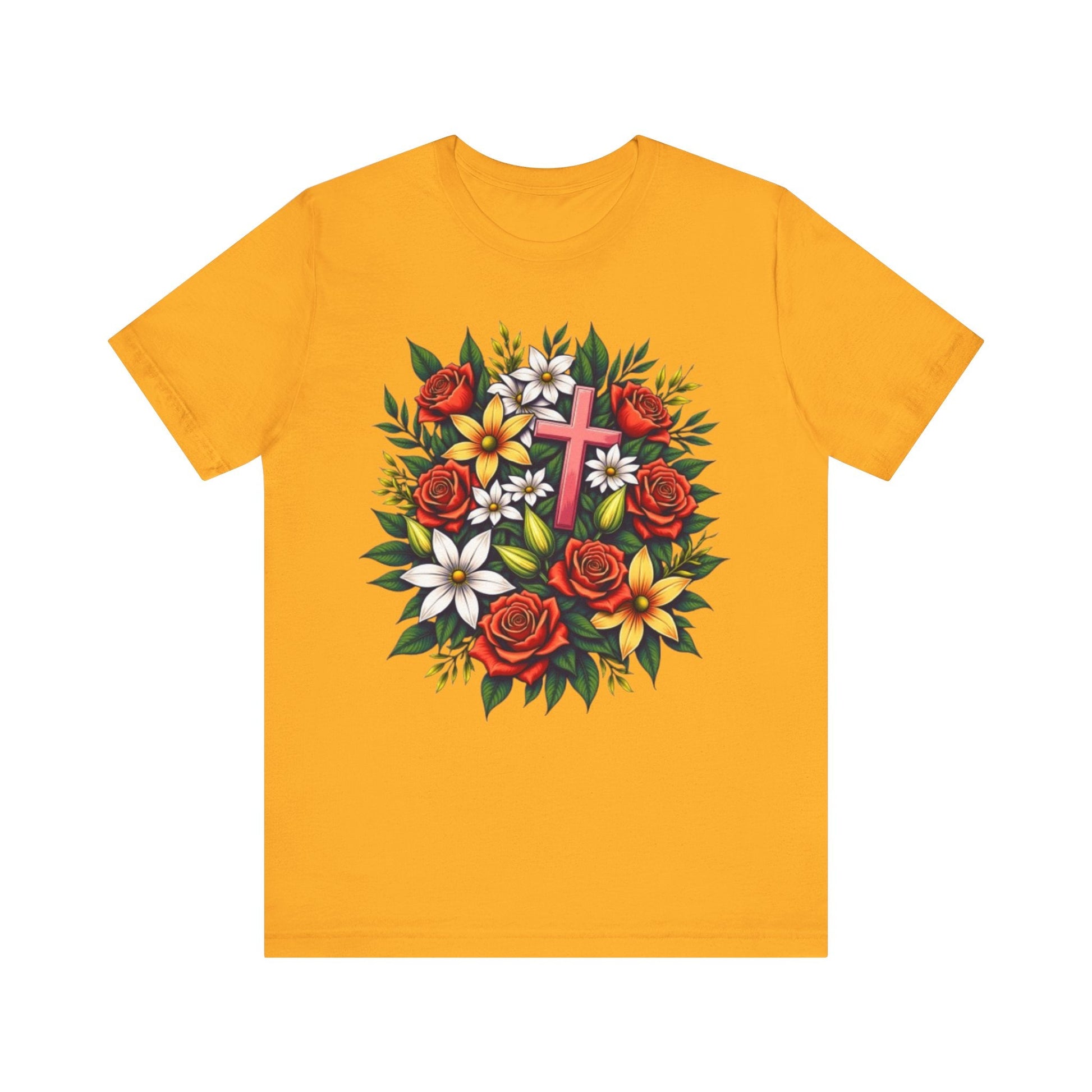 This striking design beautifully blends vibrant flowers and Christian symbols, featuring roses, lilies, and doves in a lush, colorful arrangement. Perfect for expressing spirituality with artistic flair, this artwork captivates with its bold intricacies.