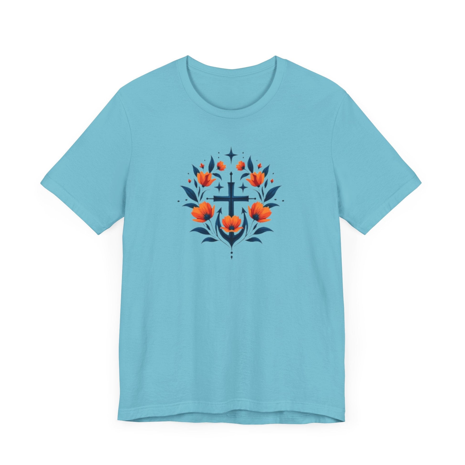 This modern abstract design features stylized tulips and poppies intertwined with minimalist Christian symbols, arranged with clean lines and a balanced geometric pattern in shades of blue, orange, and white on a crisp white background.