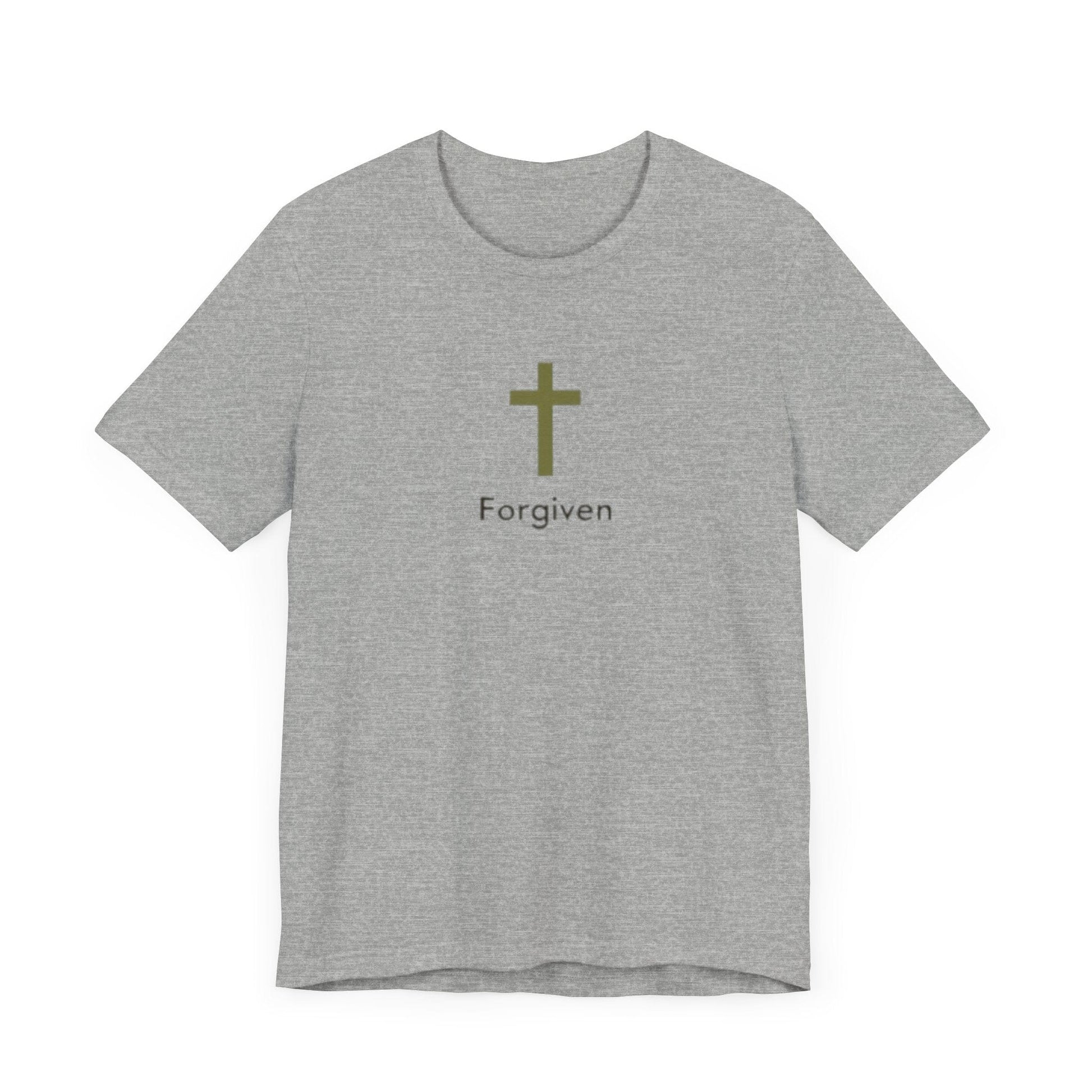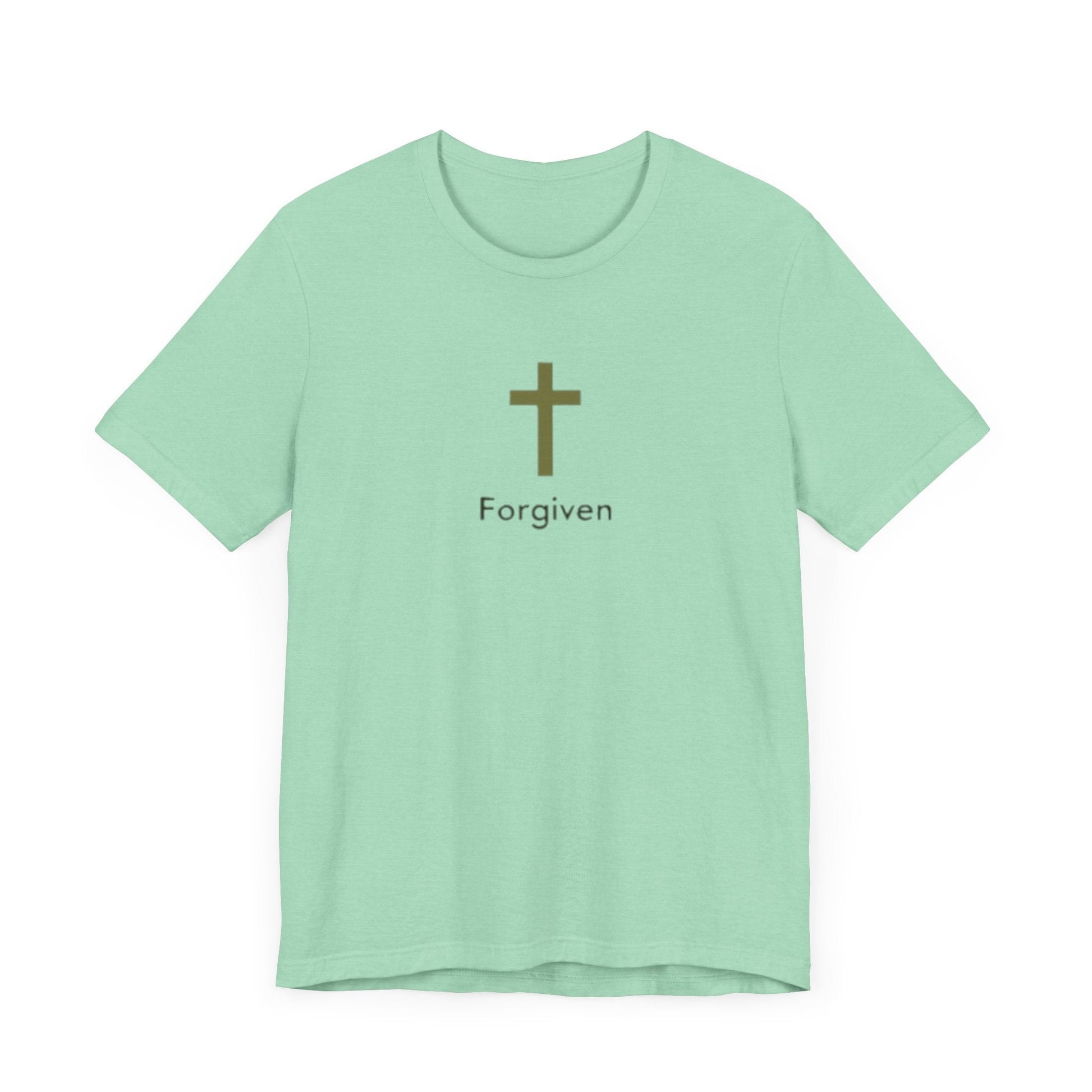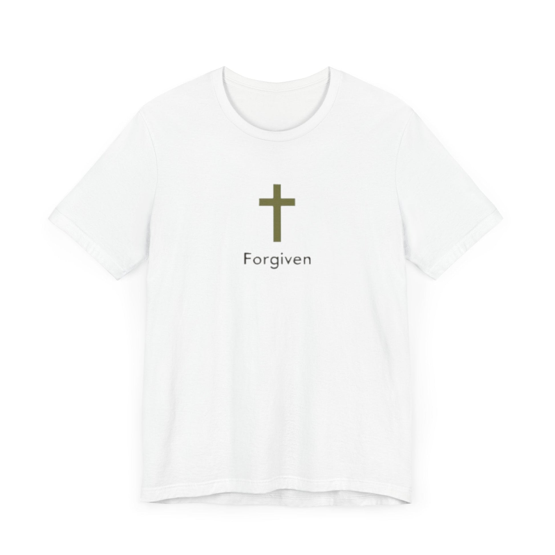 This minimalist design features a small cross with the word Forgiven in a calming sans-serif font below it, creating a serene aesthetic with muted olive green on a white background that encourages reflection.