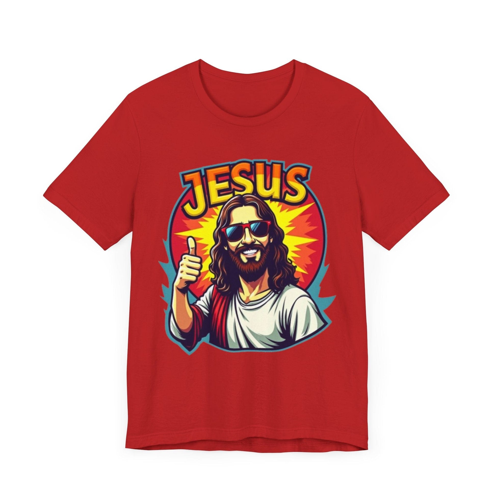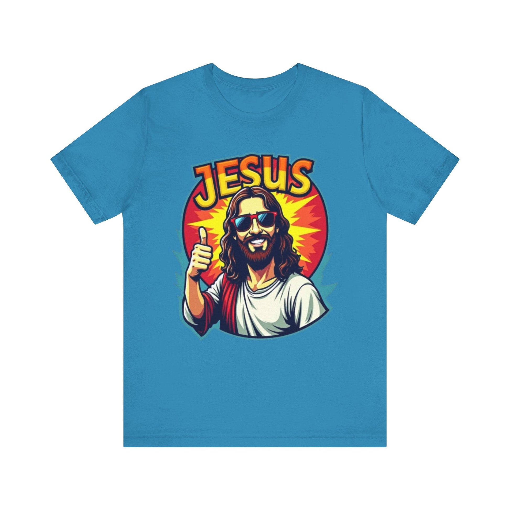 This playful cartoon design features a cheerful Jesus giving a thumbs-up while rocking sunglasses, accompanied by the bold text 'Jesus is My Homeboy'. With vibrant colors, it's a lighthearted piece that brings joy and fun.