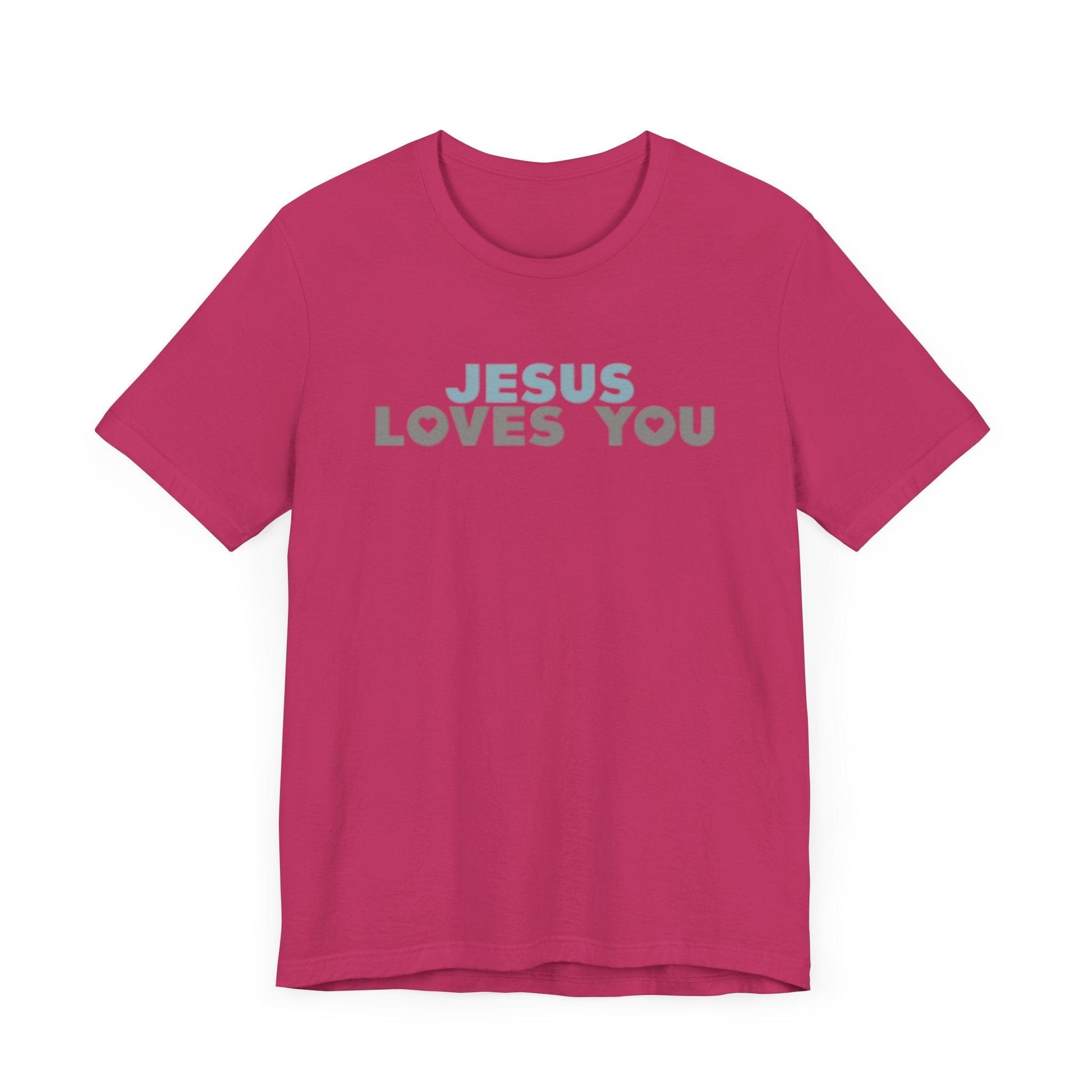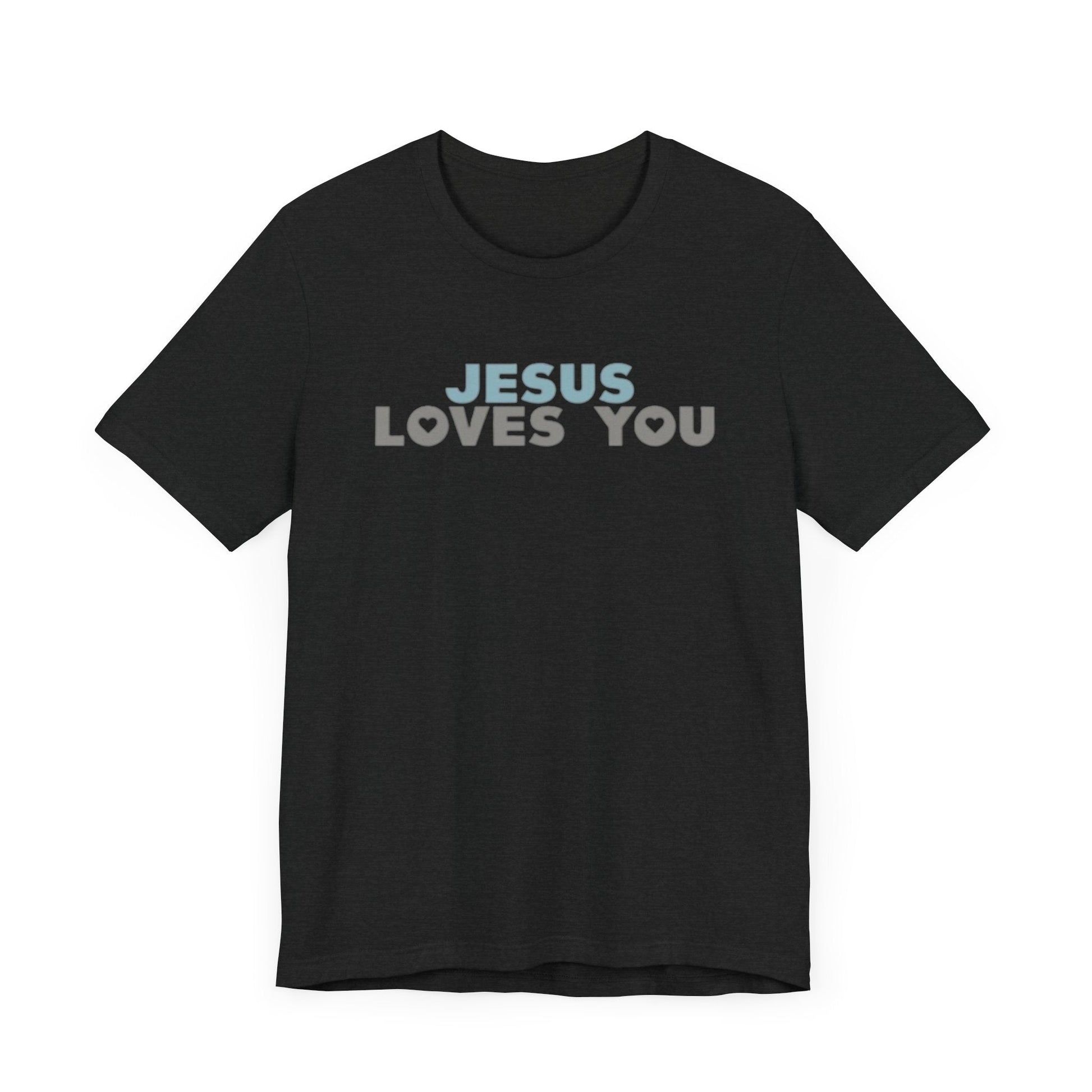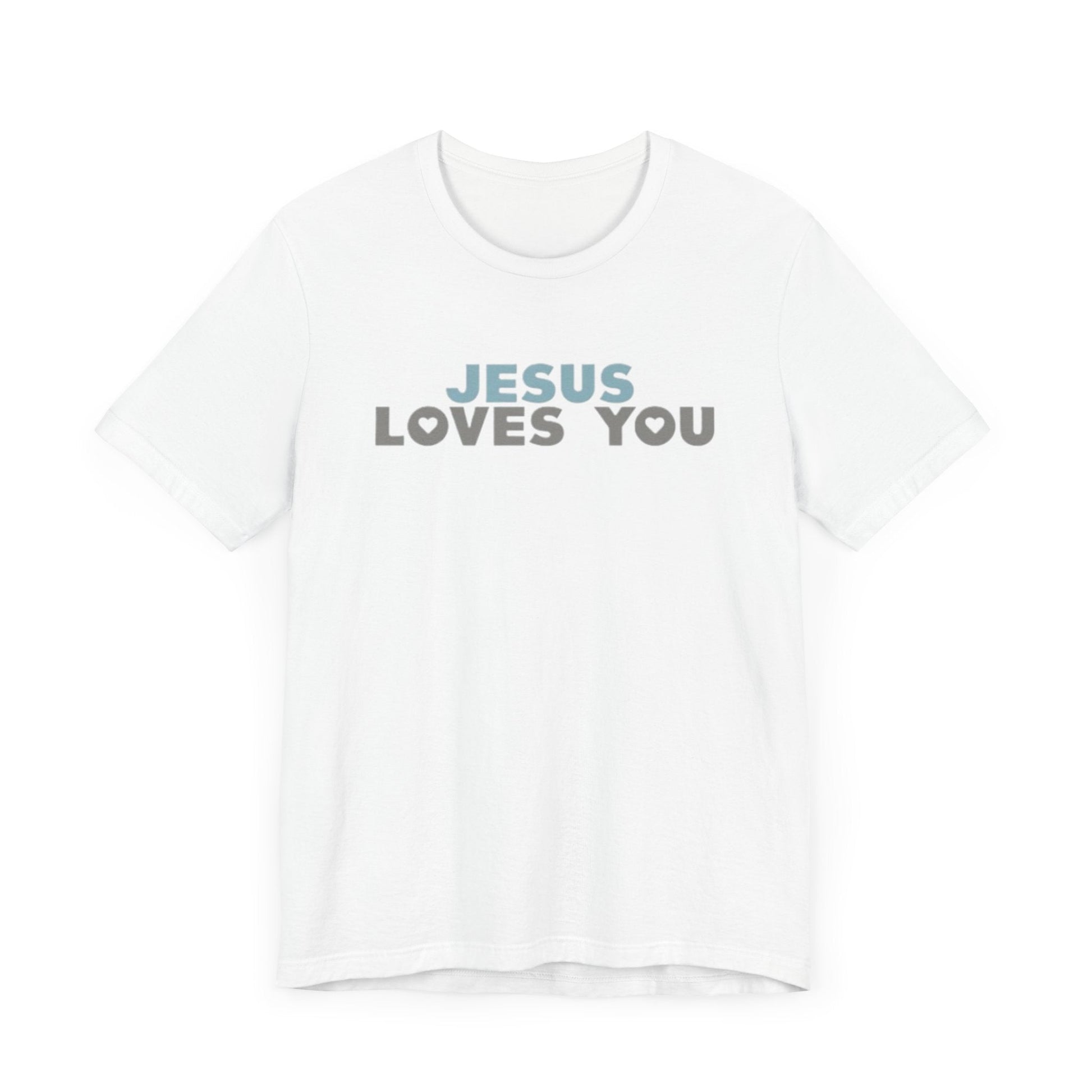 This minimalist geometric artwork visually expresses the message Jesus loves you, featuring styled letters in gray and pastel blue. The design's clever use of negative space highlights its modern aesthetic while ensuring readability.