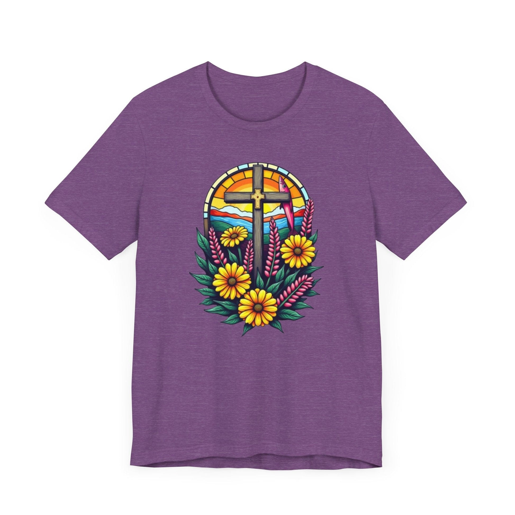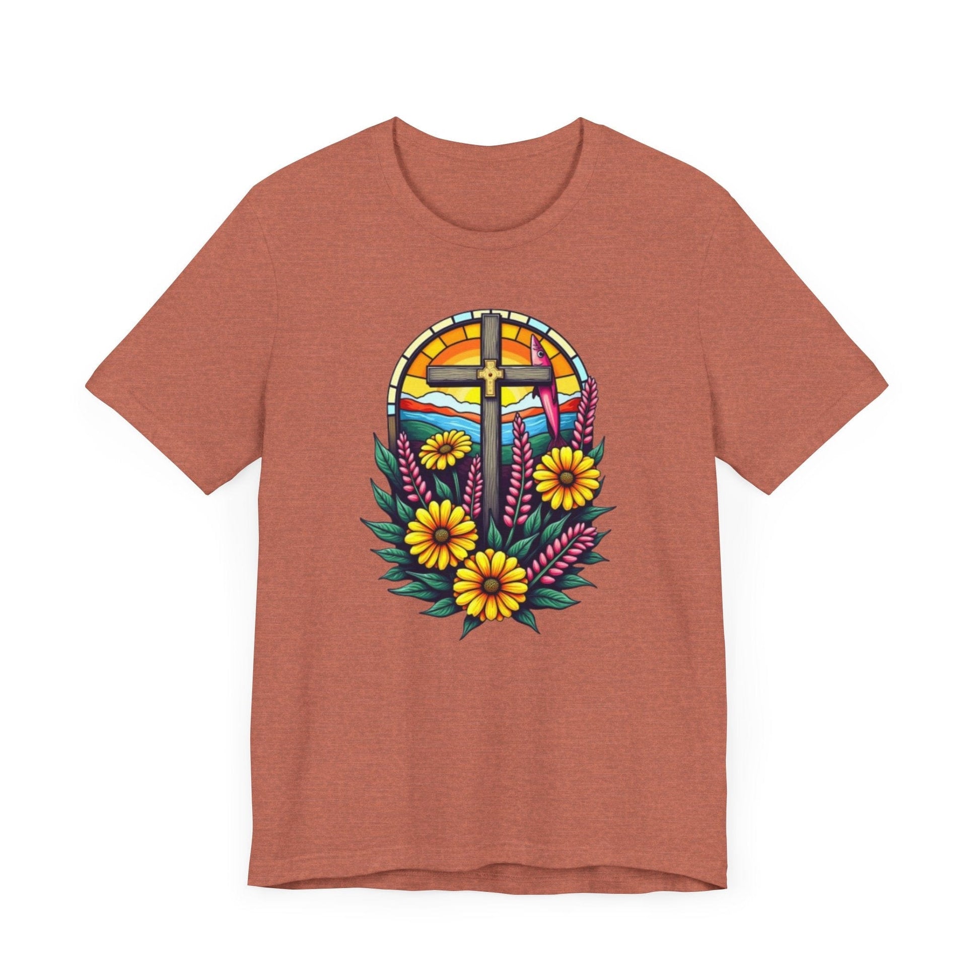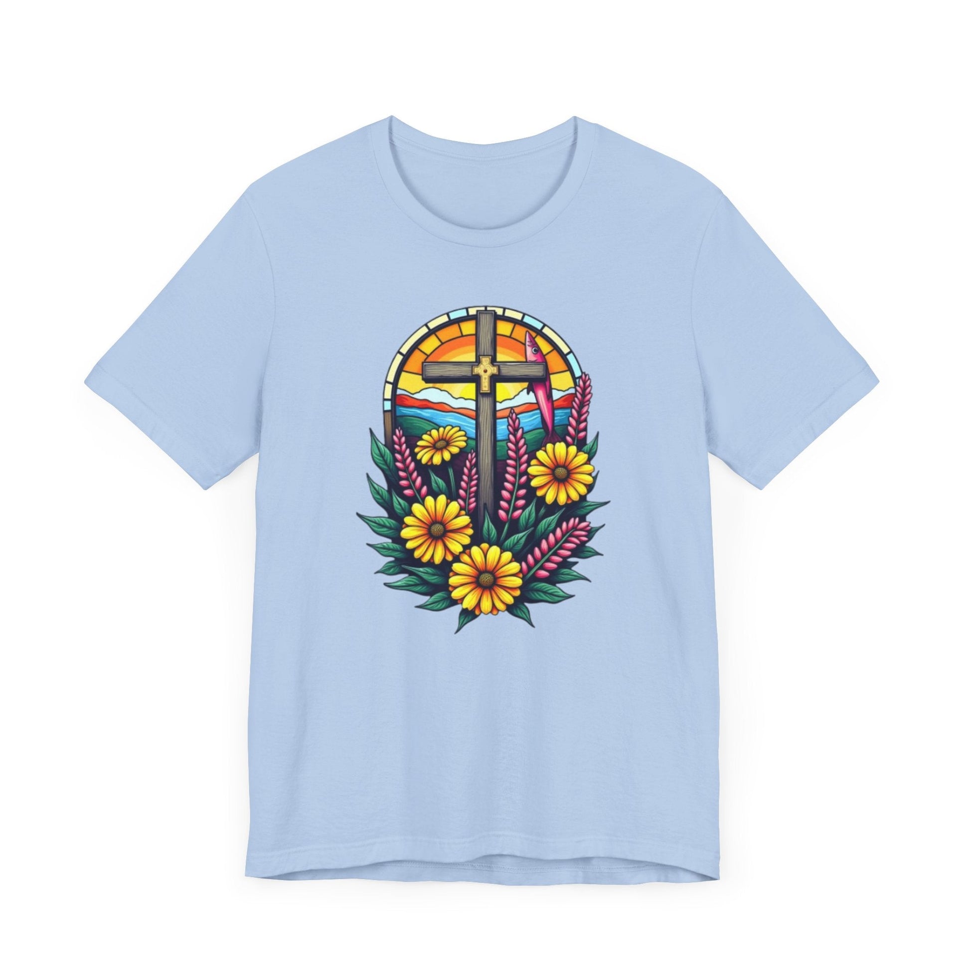 This vibrant retro-inspired design combines bold flowers and vintage Christian symbols in a lively pop art style, perfect for making a statement on graphic tees. The colorful composition stands out against a clean white background.