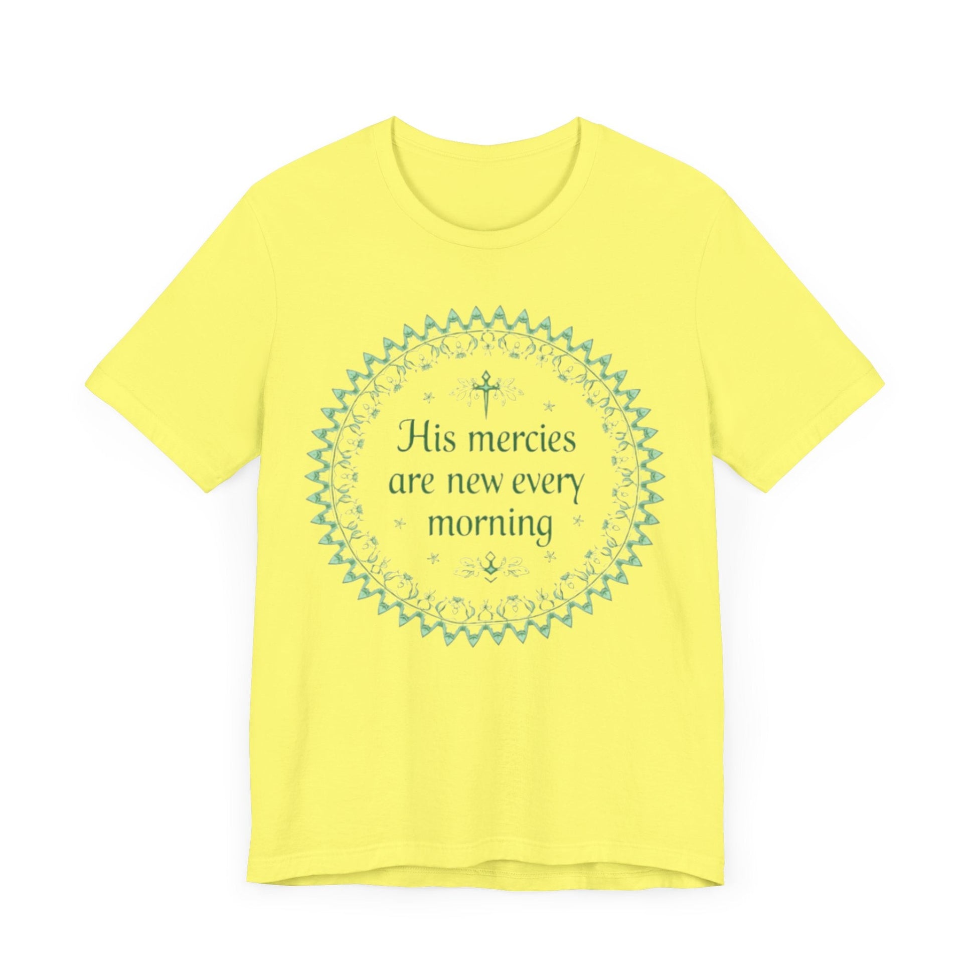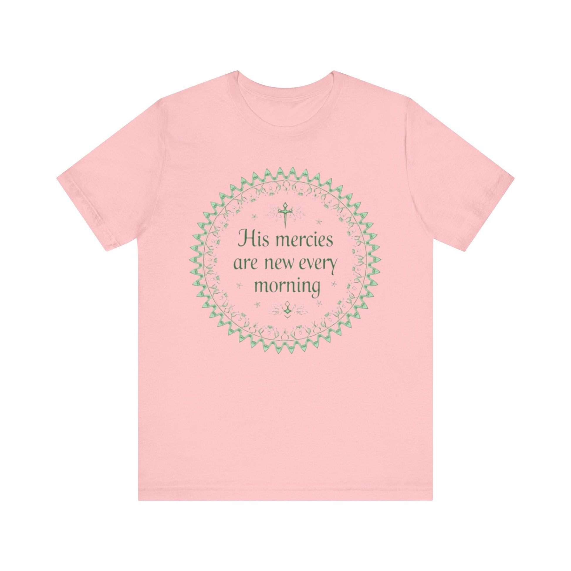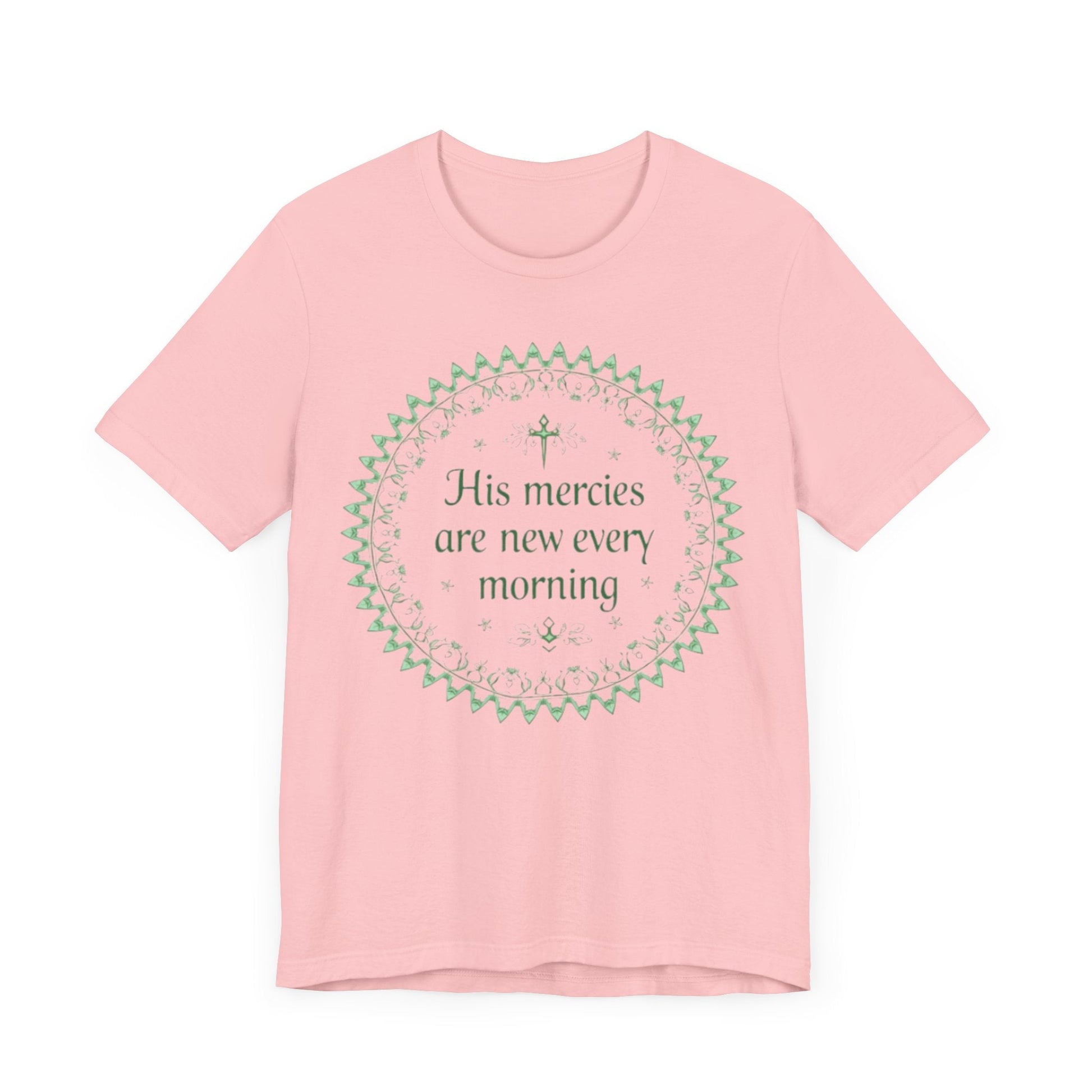Experience the serene beauty of this mandala design, featuring the uplifting phrase about mercies intertwined with delicate floral patterns and crosses in soft pastel colors, perfect for spiritual expression on a t-shirt.
