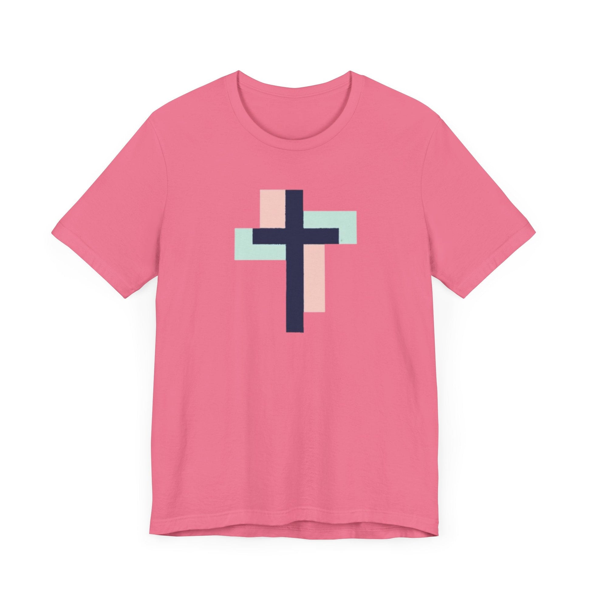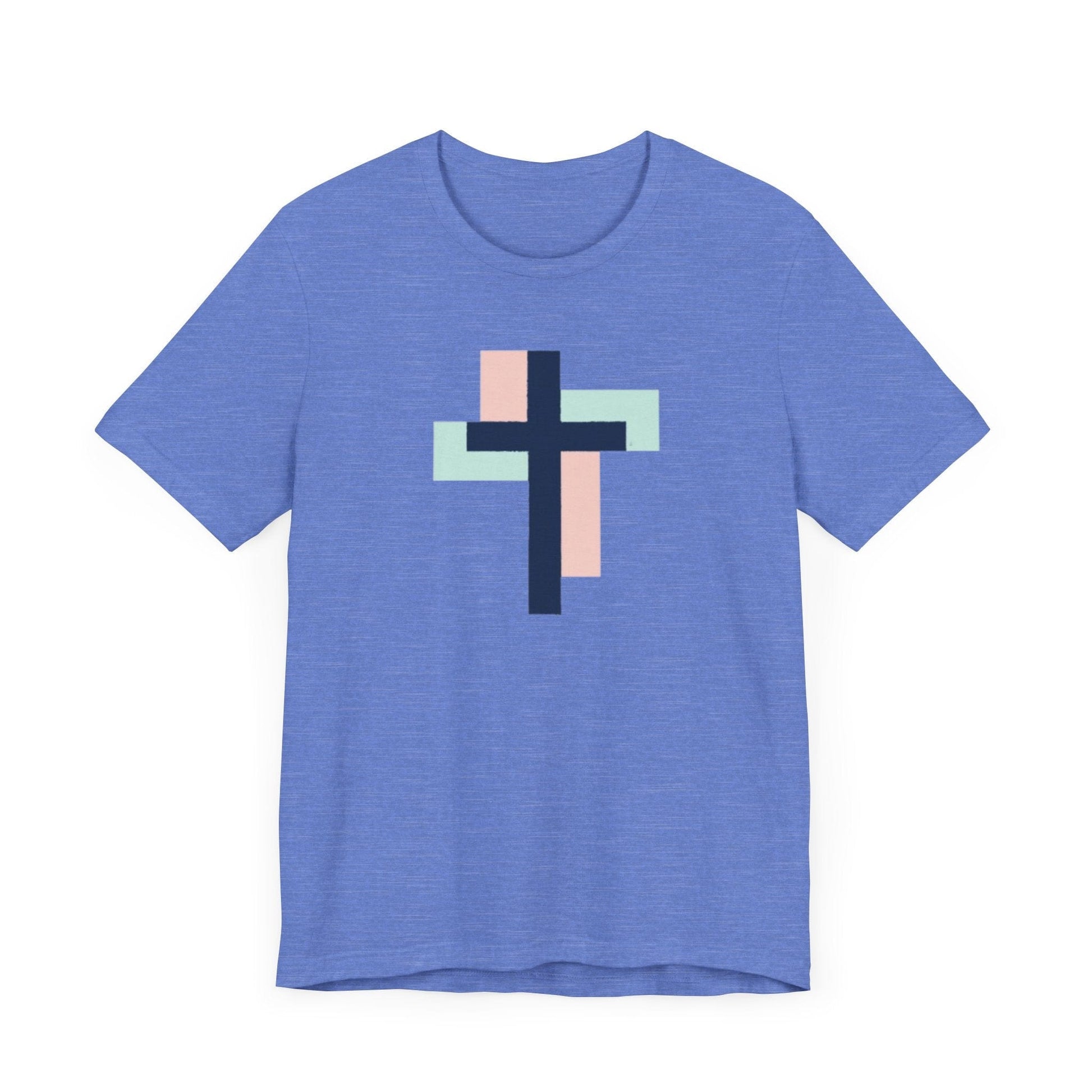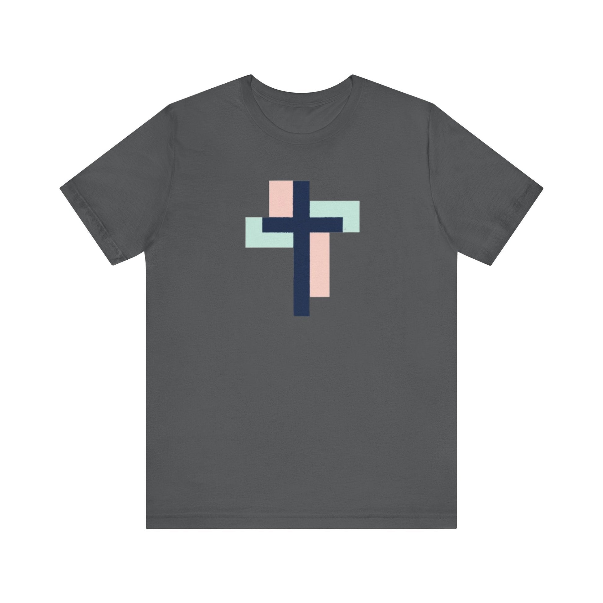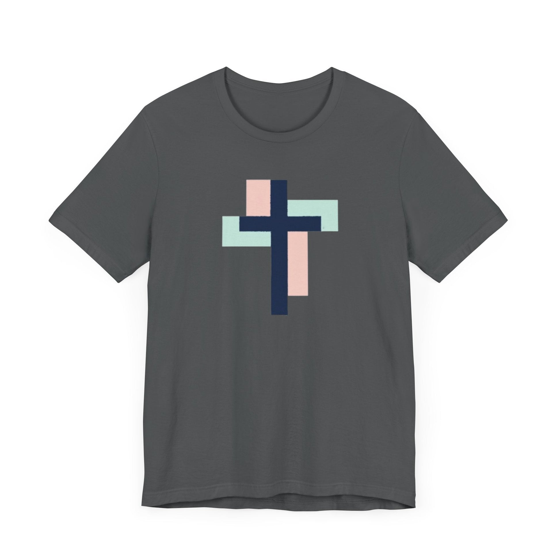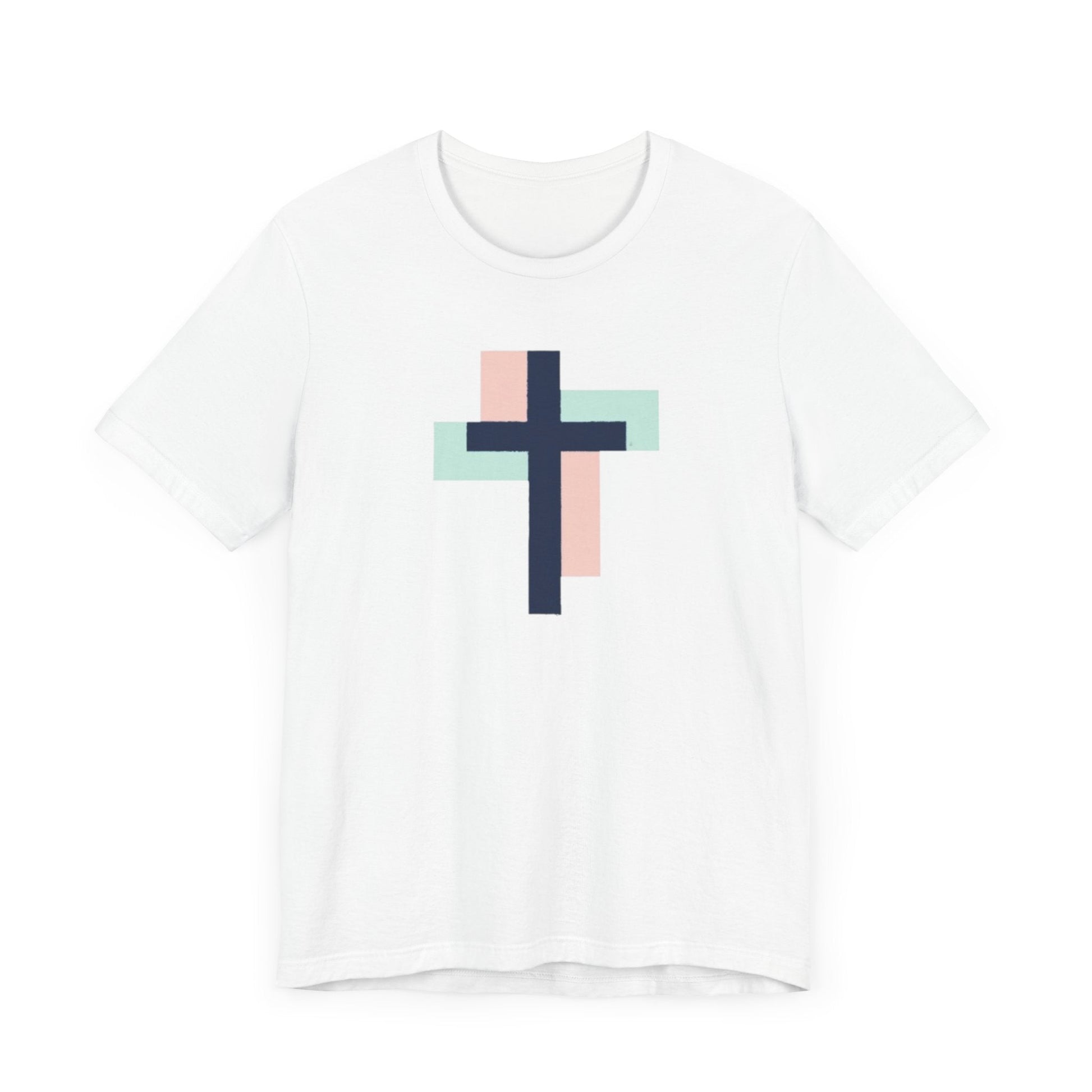 This minimalist design features a bold navy blue Christian cross centered against a white backdrop, enhanced with soft pastel geometric elements for a dynamic touch while preserving clarity and focus.