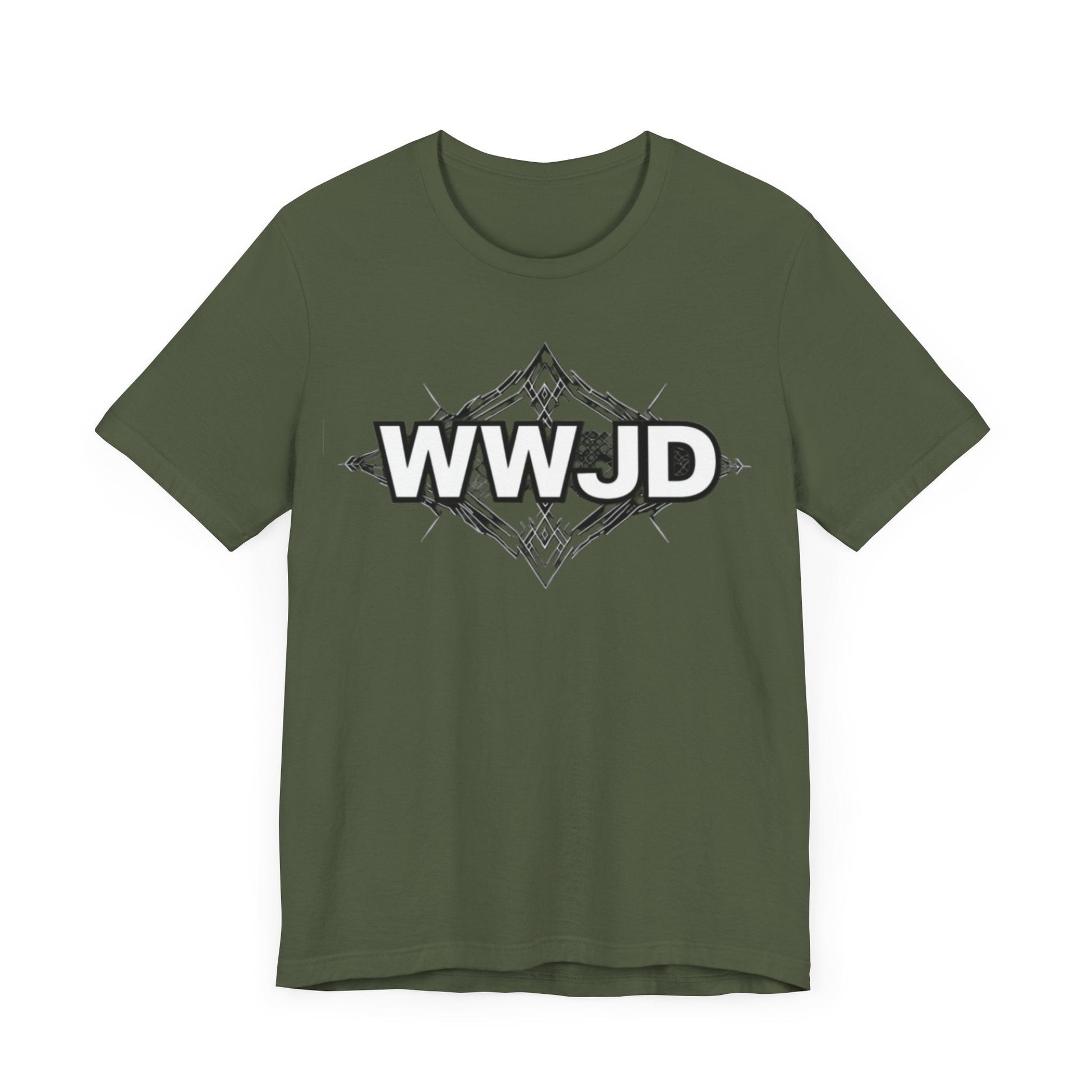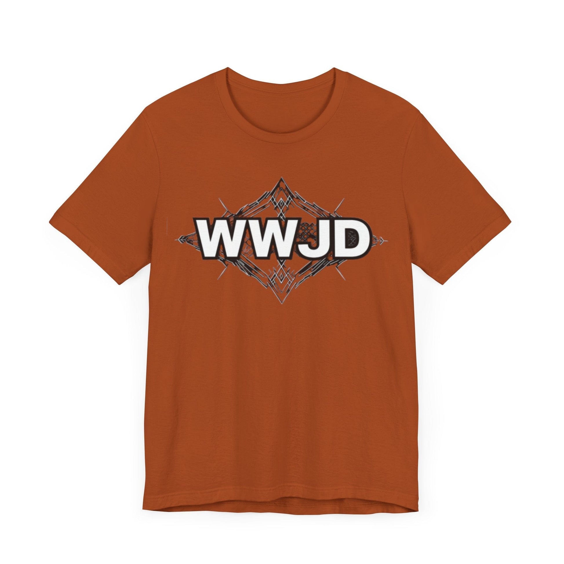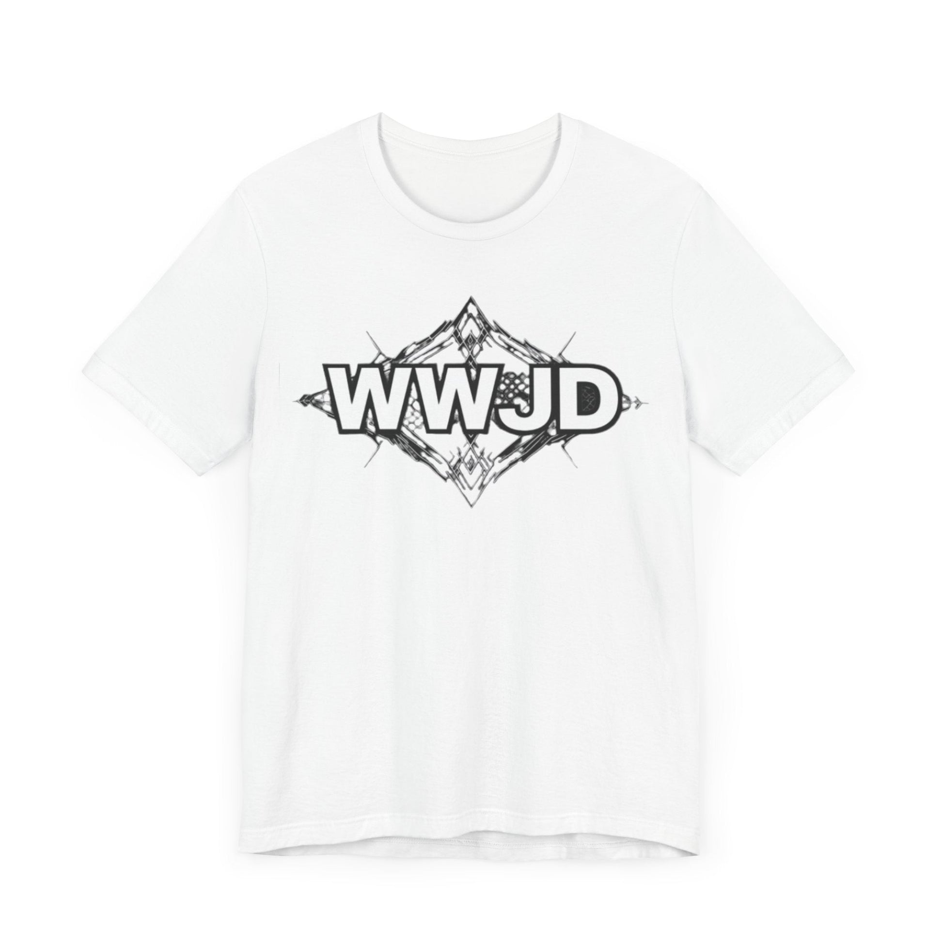Explore a sleek interpretation of faith with the bold "WWJD" design. The black text, paired with a subtle shadow and minimalist geometric patterns, creates a striking modern aesthetic perfect for any space.