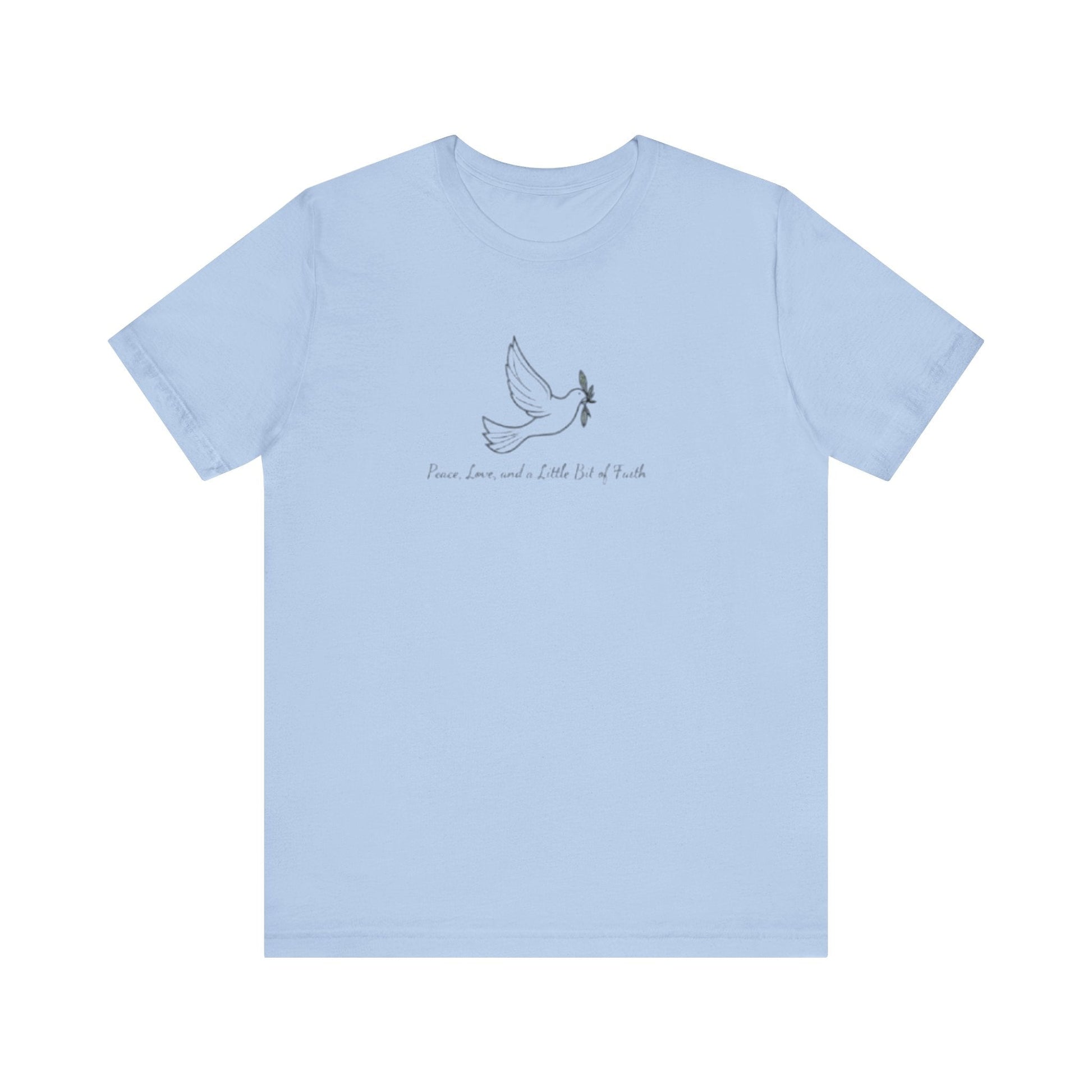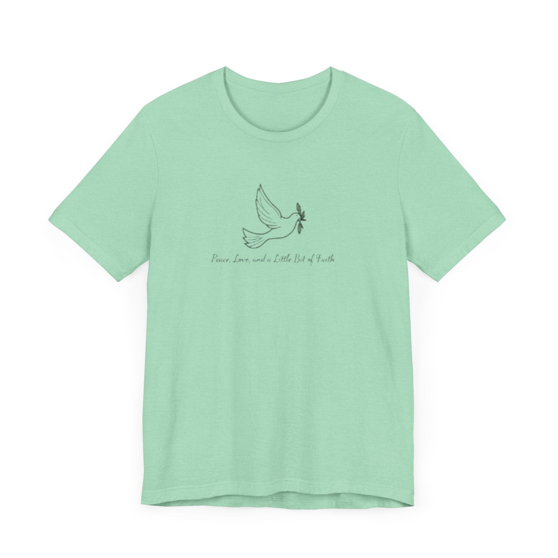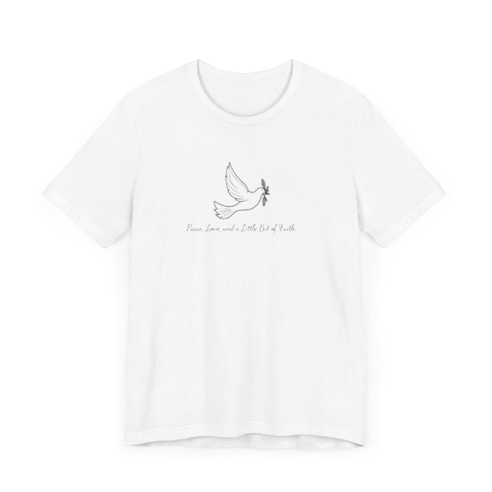 This minimalist line drawing features an elegant dove with spread wings, clutching an olive branch, embodying serenity and freedom. The design is beautifully complemented by the phrase "Peace, Love, and a Little Bit of Faith," creating a harmonious blend of grace and humor.