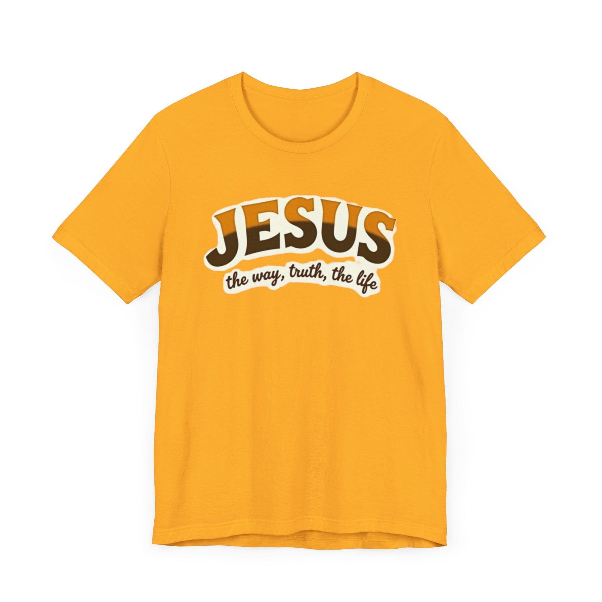 Embrace a blend of vintage vibes and spiritual inspiration with this eye-catching design featuring the word "JESUS" in a bold 70s bubble font adorned in earthy tones. The elegant cursive below adds a personal touch to your style.