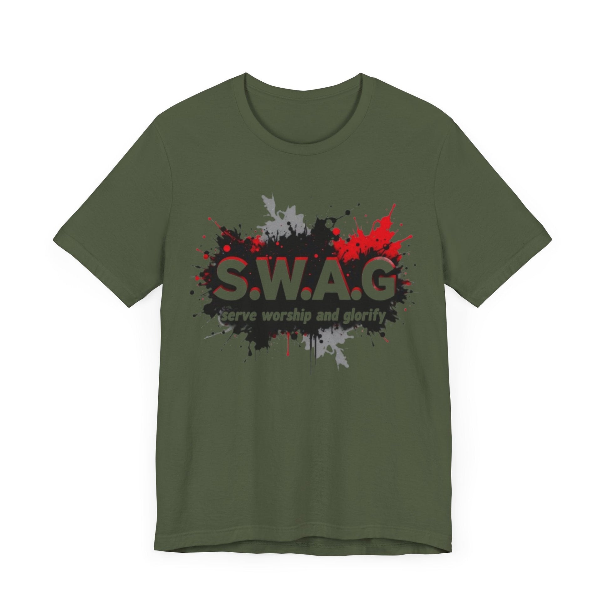 This dynamic design showcases "S.W.A.G." in bold, vibrant red stencil letters atop a striking graffiti background. Its sleek white subtext highlights the message of worship and glorification, creating an edgy, urban statement for streetwear enthusiasts.